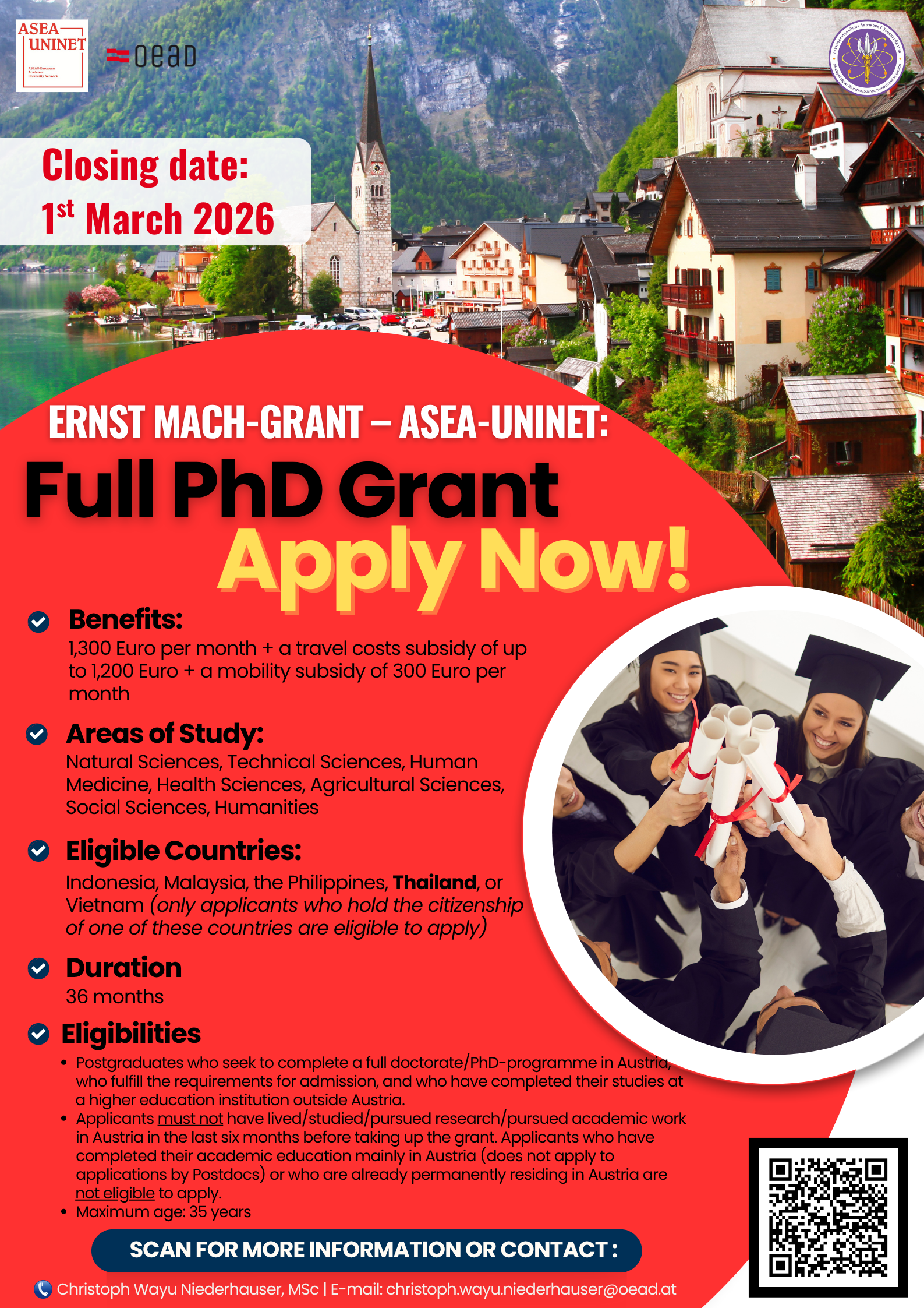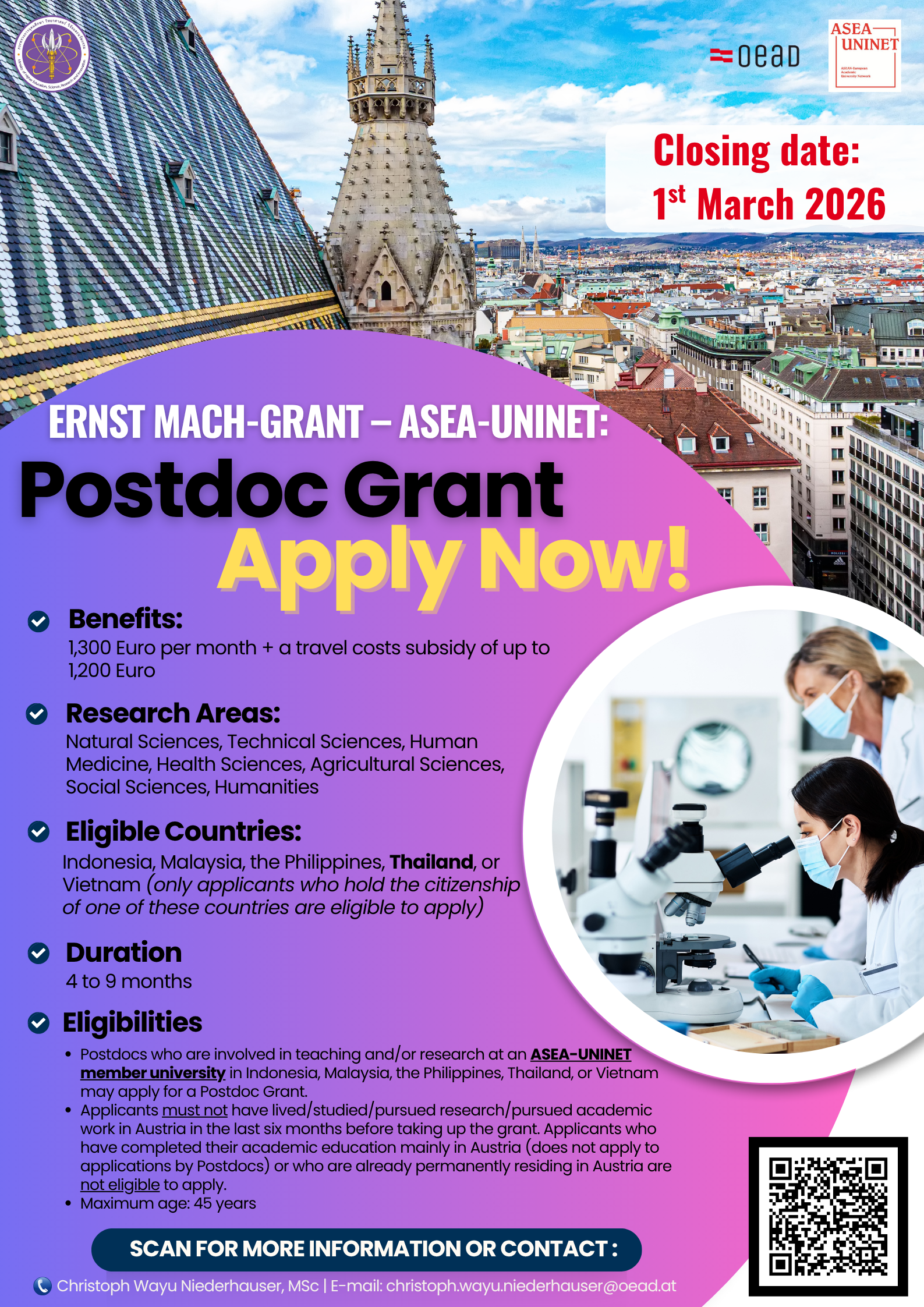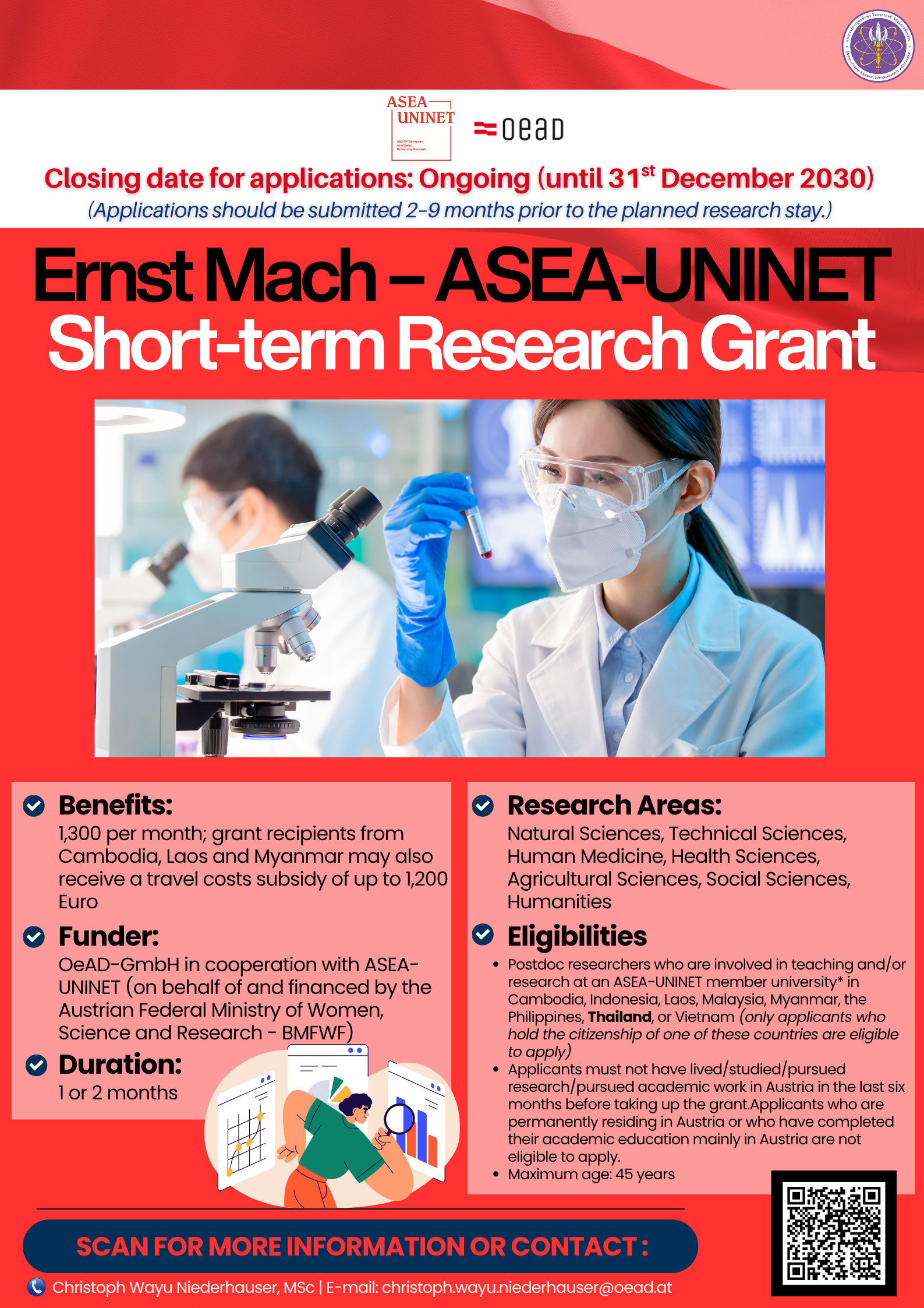 รัฐบาลออสเตรียมอบทุน Ernst Mach-Grant – ASEA-UNINET 2026/27 (PostDoc Grant)...