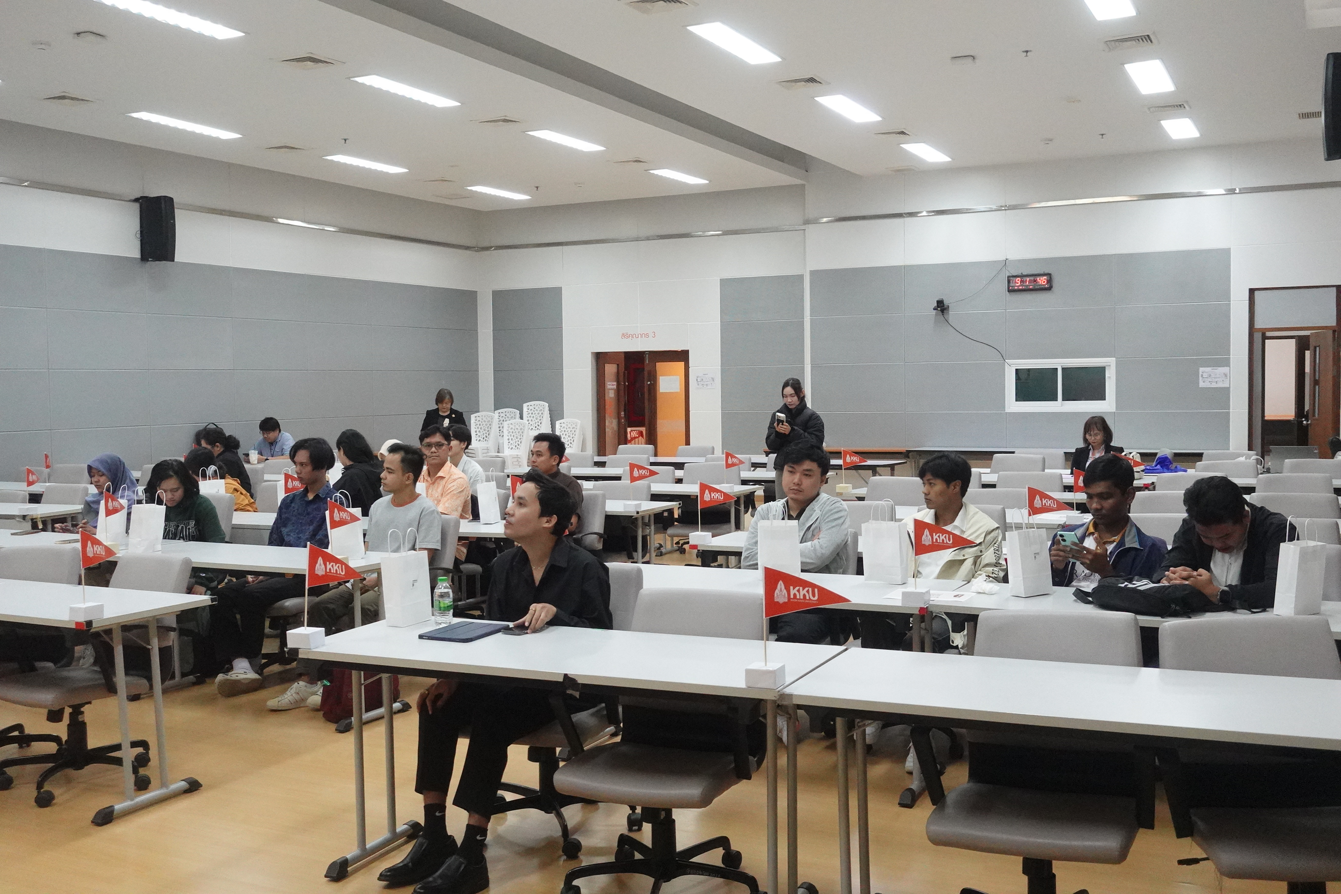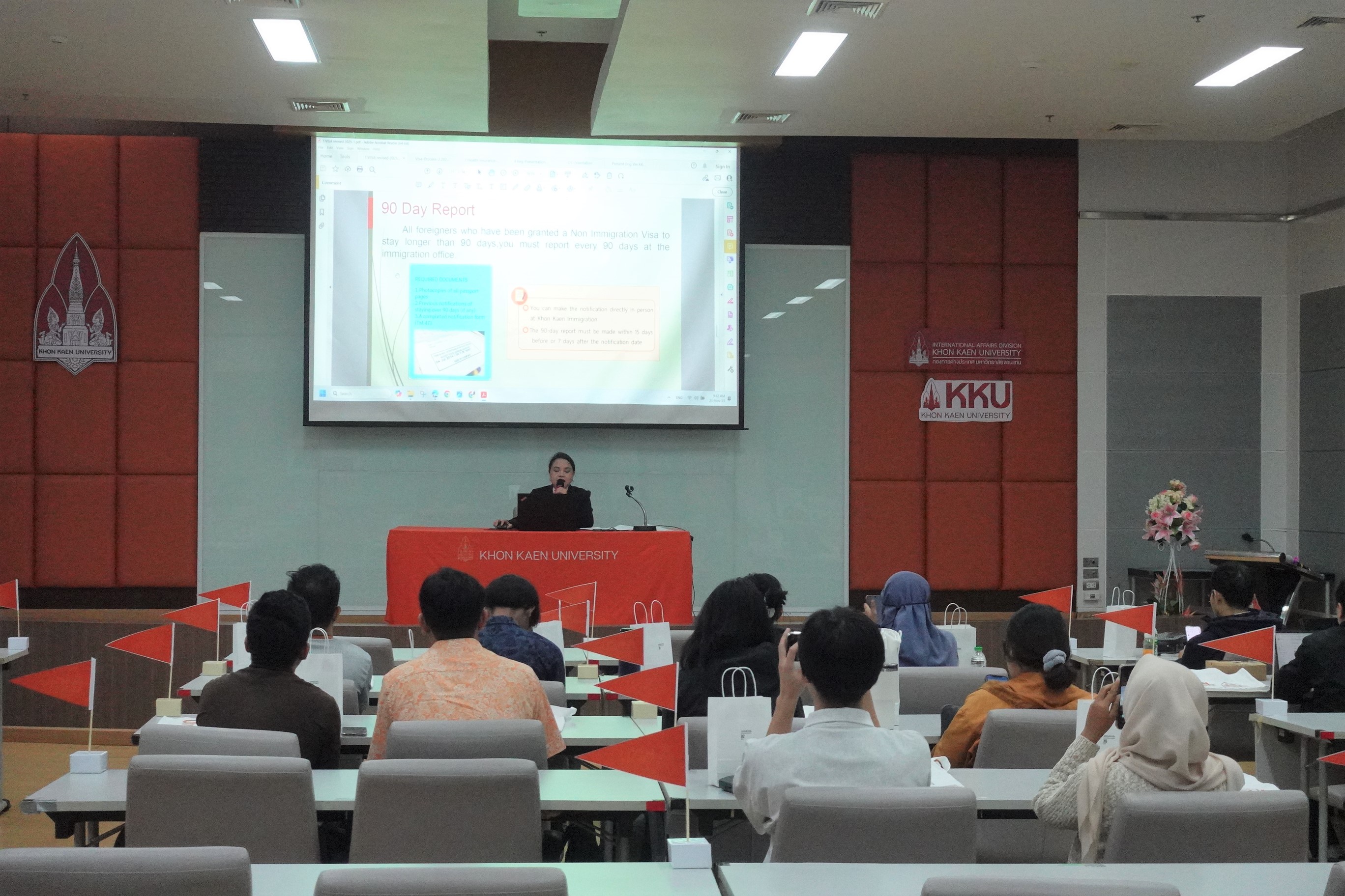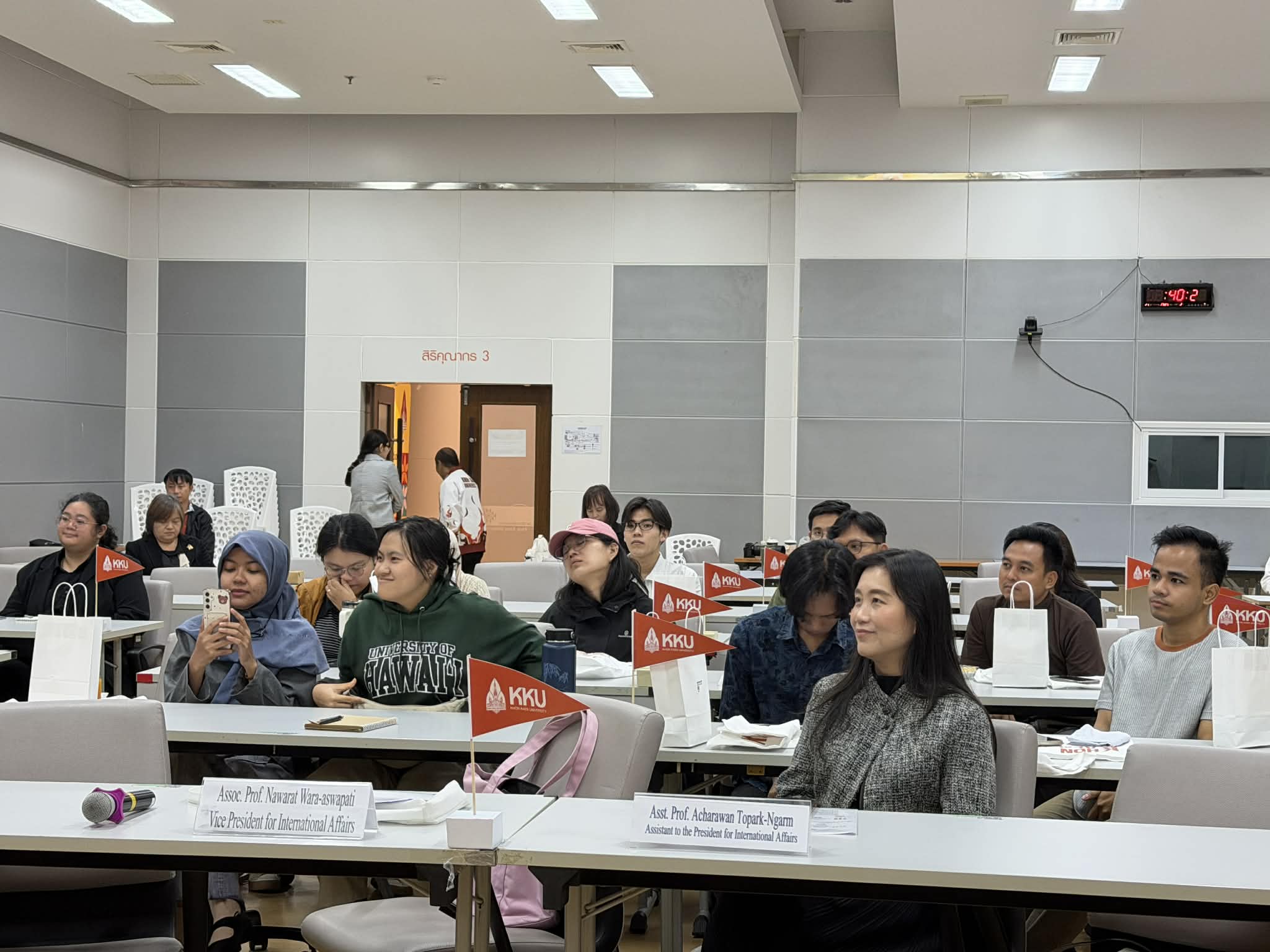 เมื่อวันที่ 21 พฤศจิกายน 2568 กองการต่างประเทศ มหาวิทยาลัยขอนแก่น จัดกิจกรรมปฐมนิเทศนักศึกษาต่างชาติ ภาคปลาย ปีการศึกษา 2568 ณ ห้องประชุมสิริคุณากร 3 ชั้น 2 อาคารสิริคุณากร ในงานนี้ ได้รับเกียรติจาก รองศาสตราจารย์ ดร.นวรัตน์ วราอัศวปติ รองอธิการบดีฝ่ายการต่างประเทศ และ ผู้ช่วยศาสตราจารย์ ดร.อัจฉราวรรณ โตภาคงาม ผู้ช่วยอธิการบดีฝ่ายการต่างประเทศ กล่าวต้อนรับนักศึกษาต่างชาติ ซึ่งกิจกรรมมีวัตถุประสงค์เพื่อเปิดโอกาสให้นักศึกษาชาวต่างประเทศในมหาวิทยาลัยขอนแก่น ได้มีโอกาสแลกเปลี่ยนเรียนรู้และพบปะร่วมกับนักศึกษาจากชาติต่างๆ อีกทั้ง มีการแนะนำข้อมูลเกี่ยวกับการบริการจากหน่วยงานต่างๆ ได้แก่ กองการต่างประเทศ บัณฑิตวิทยาลัย สำนักบริหารและพัฒนาวิชาการ สำนักเทคโนโลยีดิจิตัล สำนักหอสมุด และกองการกีฬา นอกจากนี้ ในช่วงท้ายยังมีกิจกรรม International student talk and share เพื่อแชร์ประสบการณ์การใช้ชีวิตของนักศึกษาต่างชาติ ในมหาวิทยาลัยขอนแก่น โดยมีผู้แทนชมรมนักศึกษาต่างชาติเข้าร่วมแลกเปลี่ยนกิจกรรมดังกล่าว