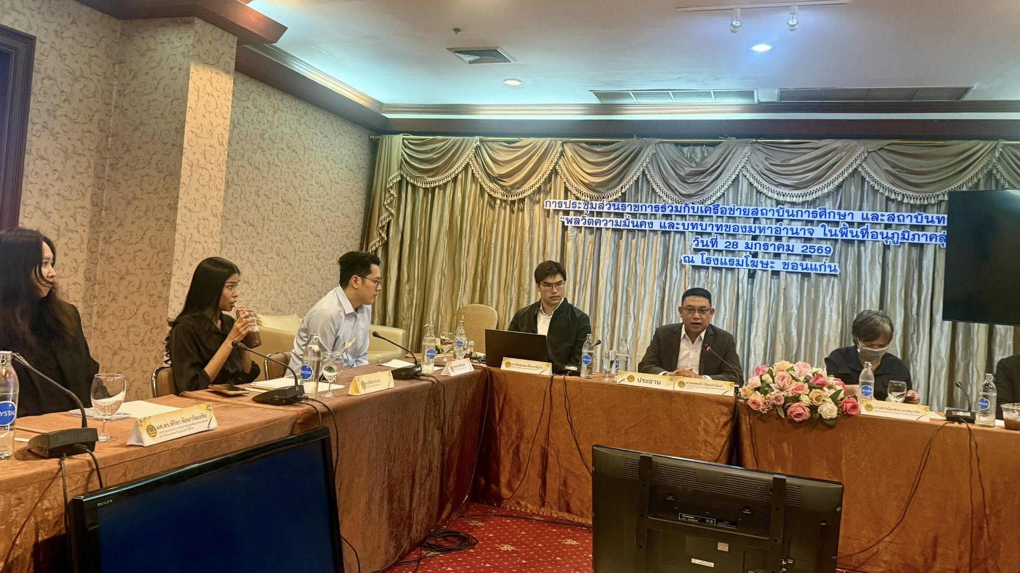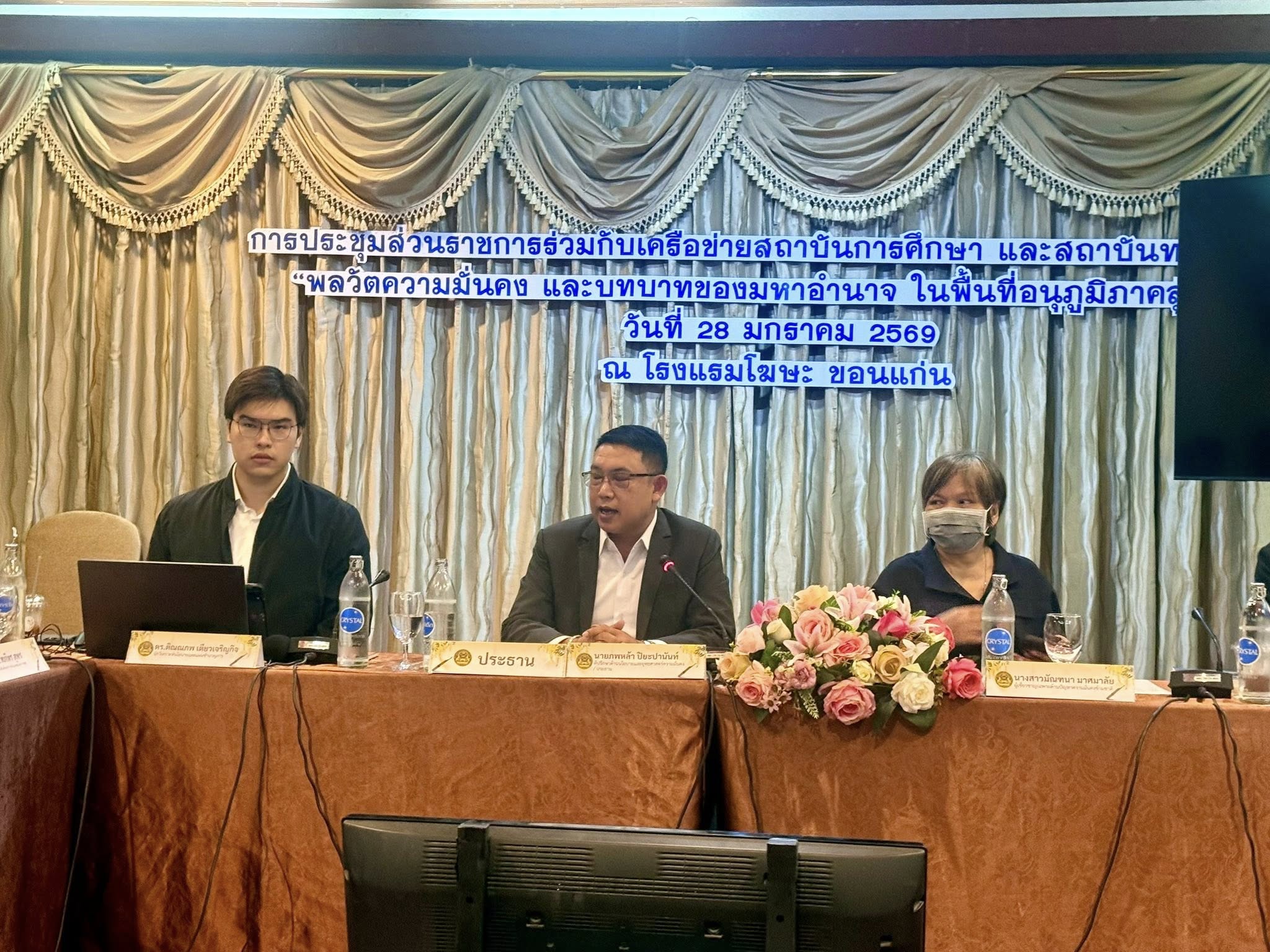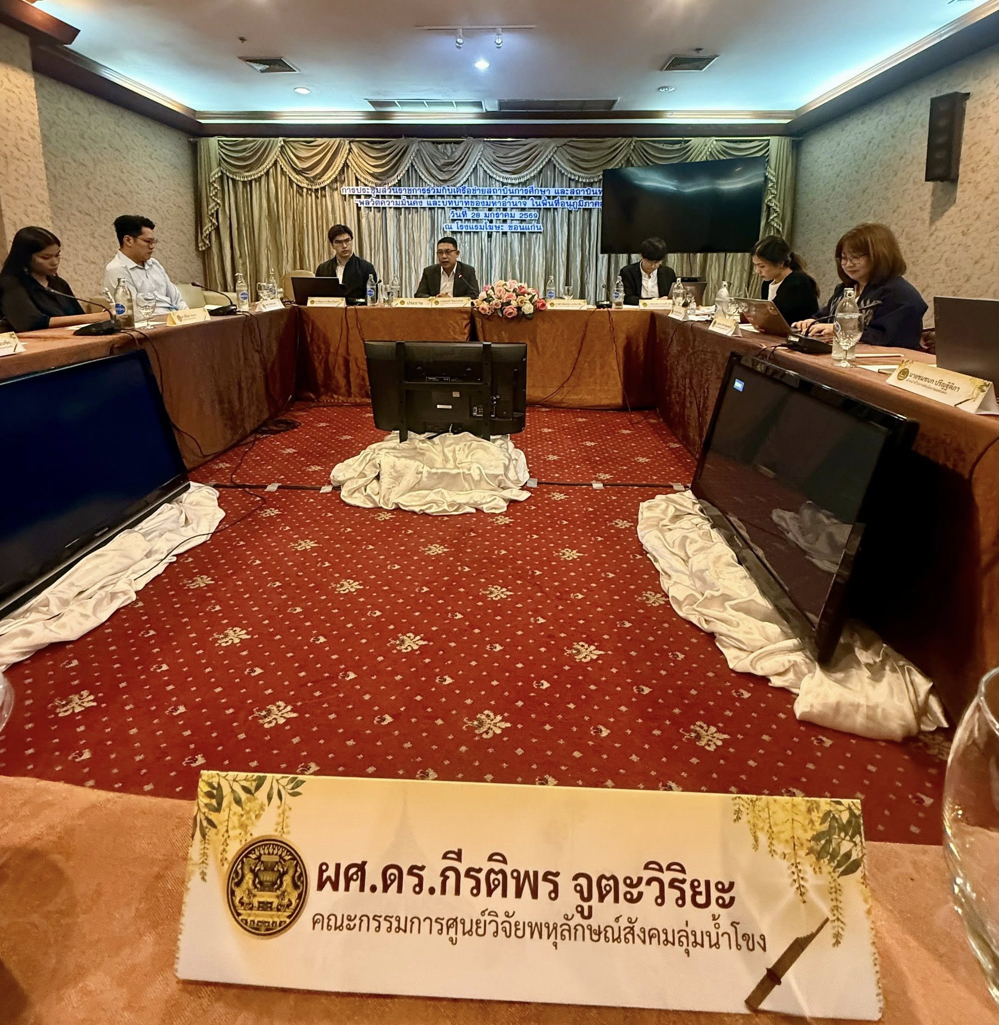 โดยมี รศ.ดร.ธนนันท์ บุ่นวรรณา ประธานหลักสูตรศิลปศาสตรมหาบัณฑิต สาขาวิชาลุ่มน้ำโขงศึกษา มหาวิทยาลัยขอนแก่นและผู้ทรงคุณวุฒิประจำสมาคมภูมิภาคศึกษา ผศ.ดร.กีรติพร จูตะวิริยะ รักษาการผู้อำนวยการศูนย์อาเซียนศึกษา และศูนย์วิจัยพหุลักษณ์สังคมลุ่มน้ำโขง มหาวิทยาลัยขอนแก่น ผศ.ดร.พิริยา พิทยาวัฒนชัย และดร.สิริฉัตร รักการ อาจารย์ประจำหลักสูตรปริญญาตรี สาขาวิชาเอเซียตะวันออกเฉียงใต้ศึกษา มหาวิทยาลัยขอนแก่น ร่วมประชุมกำหนดทิศทางและแนวทางเพื่อหารือในประเด็นความมั่นคงทางสังคม ด้านอัตลักษณ์ และสิ่งแวดล้อม รวมถึงประเด็นที่เกี่ยวข้องด้านความสัมพันธ์ระหว่างประเทศ เมื่อวันที่ 28 มกราคม 2569 ณ โรงแรมโฆษะ จังหวัดขอนแก่น