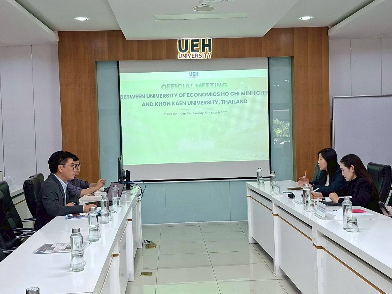 On 18 March 2026, Khon Kaen University, led by Assistant Professor Atcharawan Topakn-gam, Assistant to the President for International Affairs, together with representatives from the Graduate School and the International Affairs Division, visited the University of Economics Ho Chi Minh City (UEH) in the Socialist Republic of Vietnam to discuss academic cooperation in broader and deeper dimensions with Assoc. Prof. Pham Khanh Nam, Head Department of Research Development and Globa; Engagement, University of Economics Ho Chi Minh City (UEH)