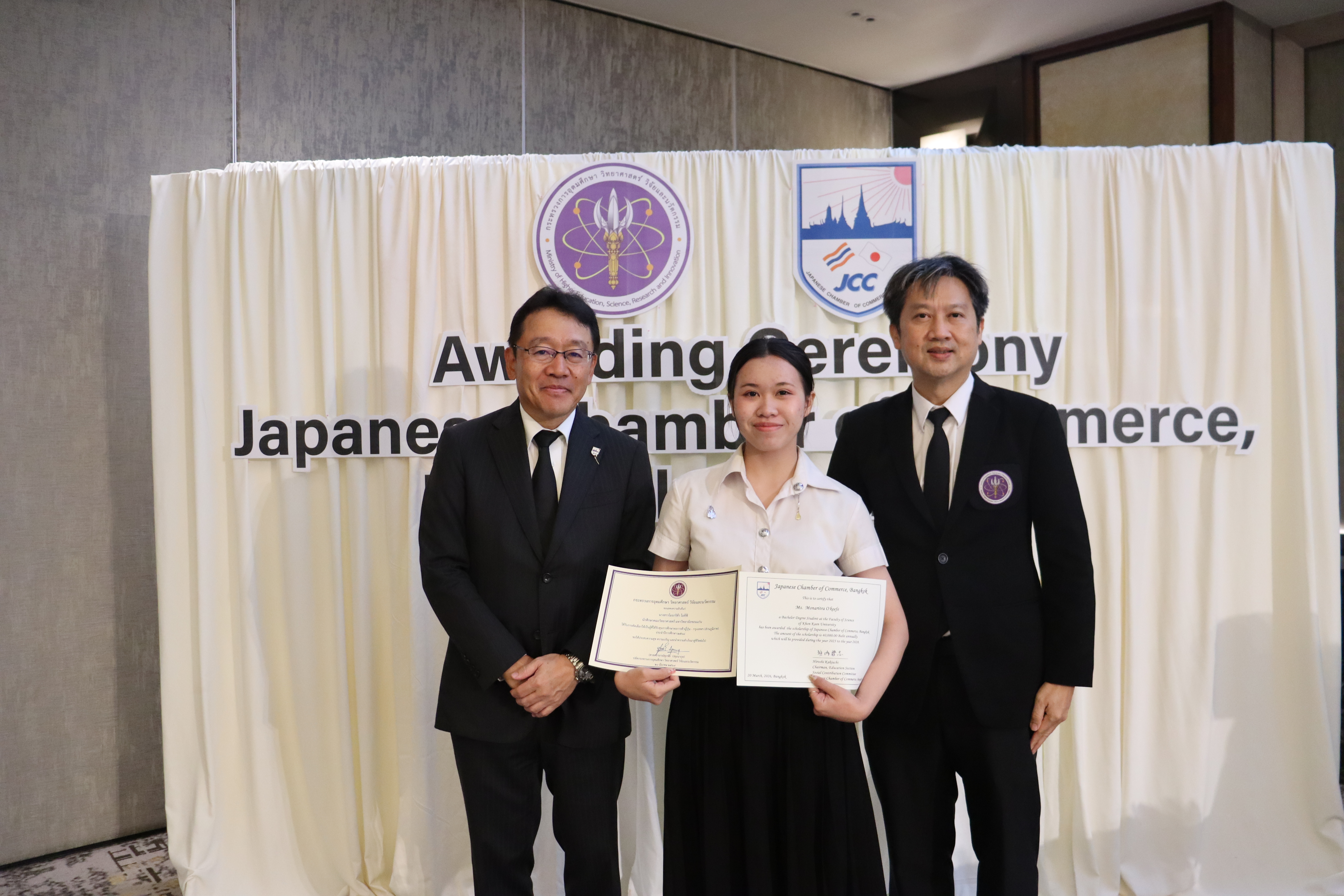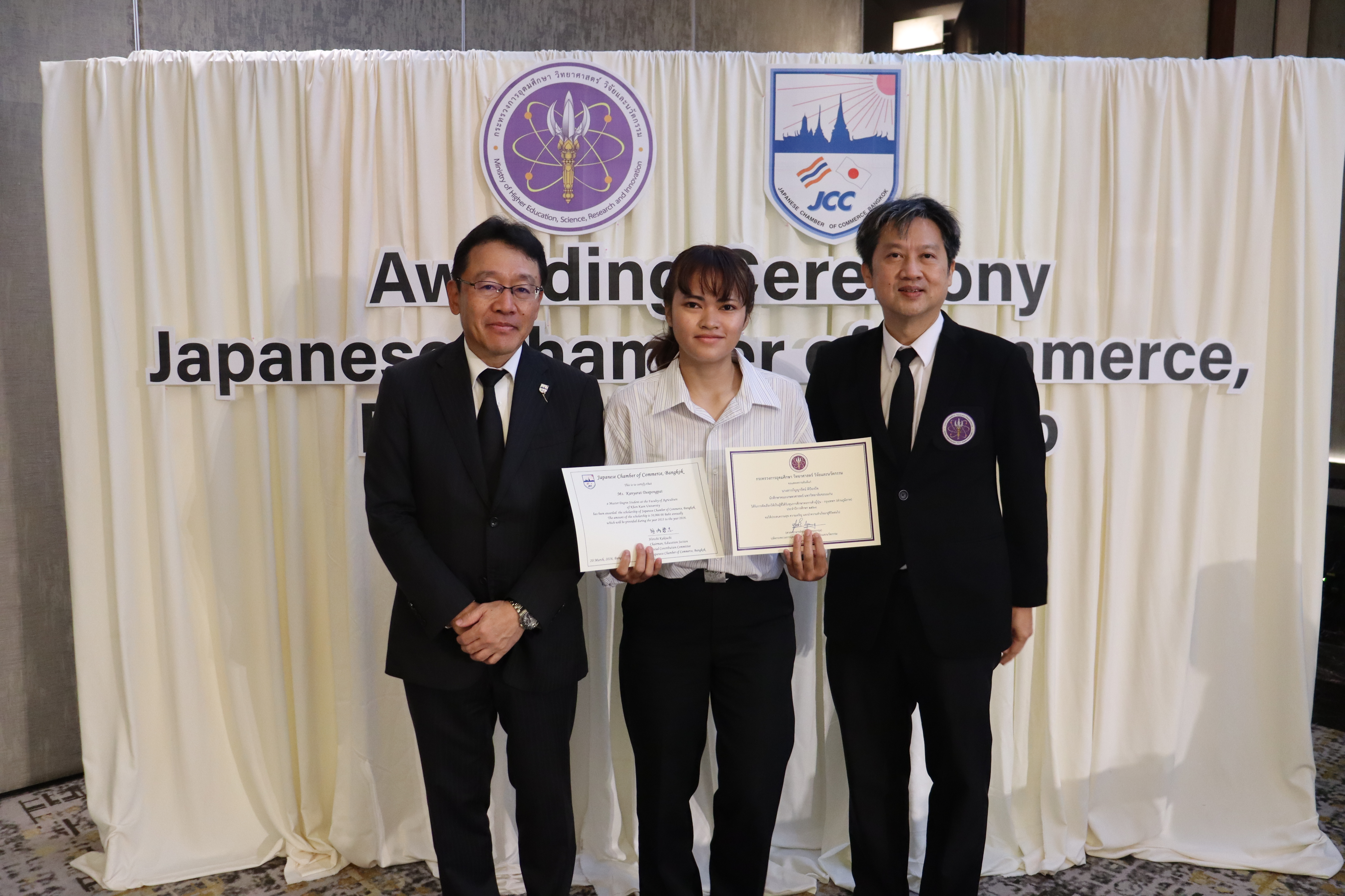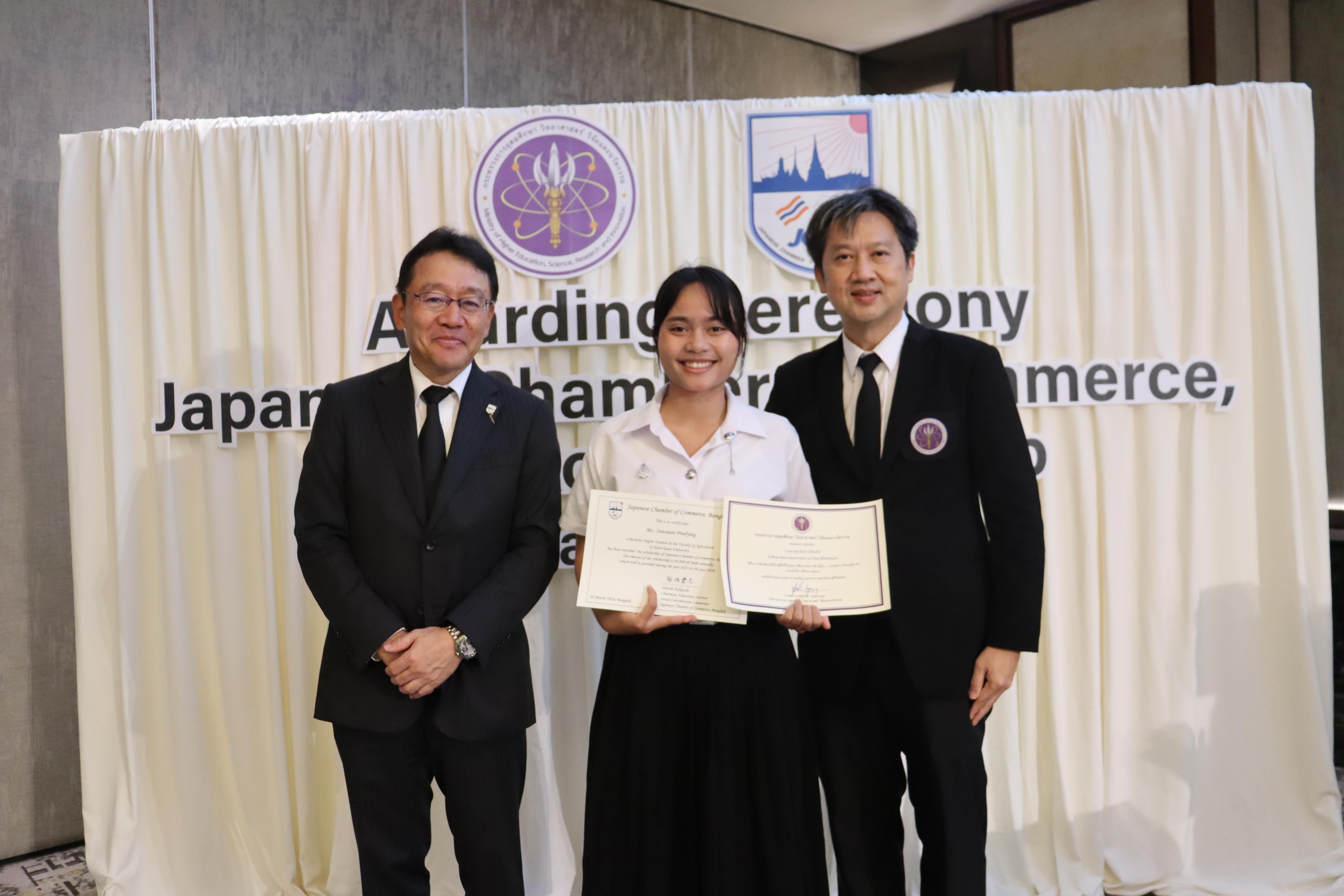 ภายในพิธีได้รับเกียรติจาก นายฮิโรชิ คากิอุจิ รองประธานหอการค้าญี่ปุ่นฯ และประธานส่วนการศึกษา คณะกรรมการสมทบส่วนท้องถิ่น JCC เป็นผู้มอบประกาศนียบัตรทุนการศึกษา พร้อมด้วย นายศุภโชค สุขมาก ผู้อำนวยการกองส่งเสริมและพัฒนากำลังคน สำนักงานปลัดกระทรวงการอุดมศึกษา วิทยาศาสตร์ วิจัยและนวัตกรรม (อว.) ร่วมมอบประกาศนียบัตรแสดงความยินดี โดยในปีนี้มีนักศึกษามหาวิทยาลัยขอนแก่นได้รับคัดเลือกจำนวน 4 ราย ได้แก่: