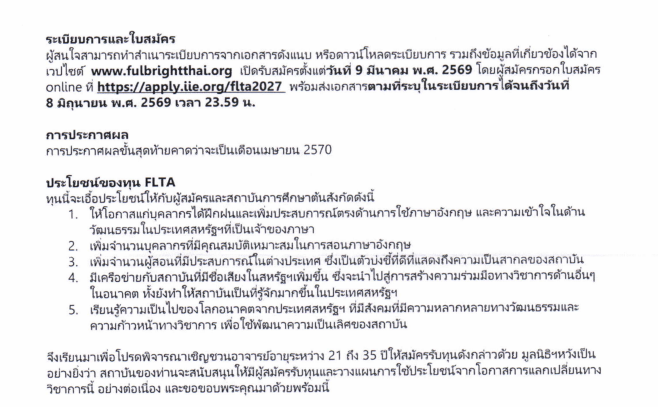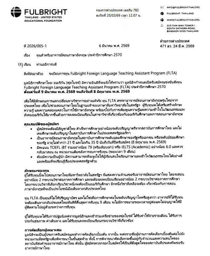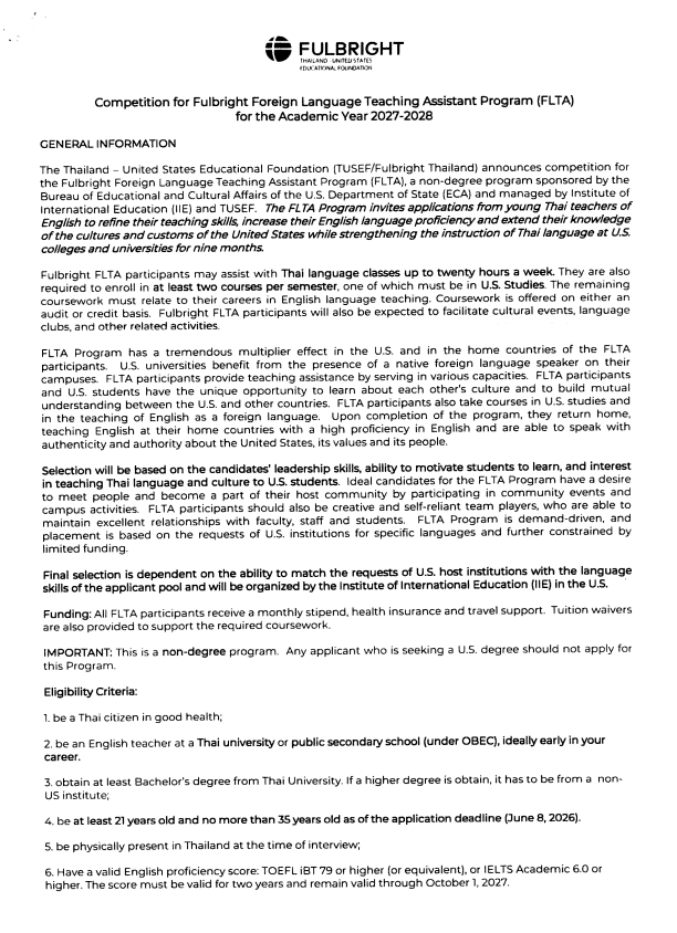 มูลนิธิการศึกษาไทย-อเมริกัน (ฟุลไบร์ท) เปิดรับสมัครแข่งขันชิงทุน Fulbright Foreign Language Assistant Program (FLTA) ประจำปีการศึกษา 2570